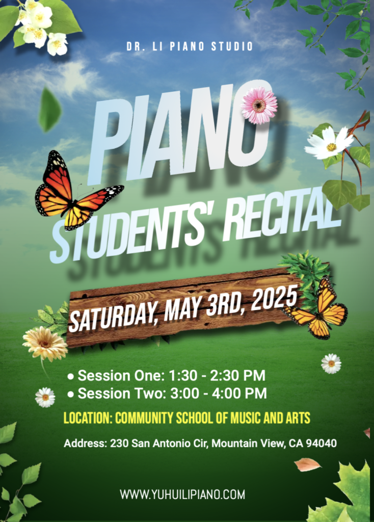 Come celebrate the musical accomplishments of our talented piano students as they perform a variety of classical and contemporary pieces. This recital is a wonderful opportunity for students to share their progress, build performance skills, and experience the joy of live music.